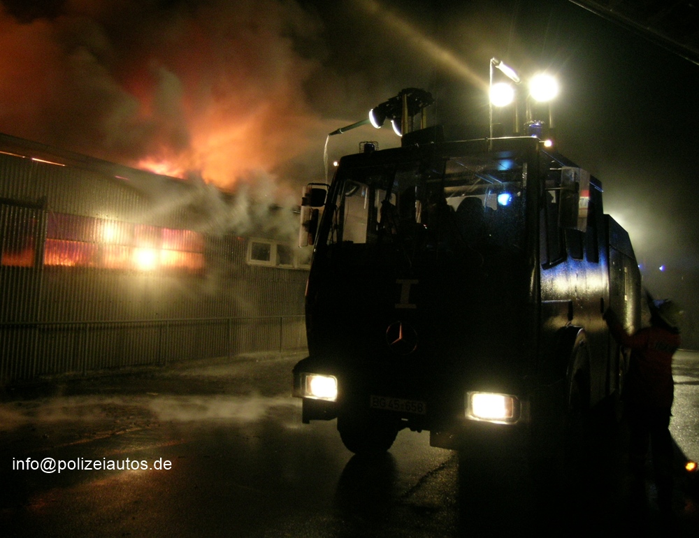 | Beschreibung: | Bei der Bekämpfung eines Großfeuers in einer Holzhandlung in Uelzen/Nds. hatten die eingesetzten Feuerwehren auf dem großflächigen Gelände Probleme mit der Wasserversorgung. Neben allen verfügbaren Löschfahrzeugen wurden auch zwei Wasserwerfer 9000 der Bundesgrenzschutzabteilung Uelzen zum Brandort entsandt und eingesetzt. Fotos: Phillip Schulze, Freiw. Feuerwehr Ebstorf |