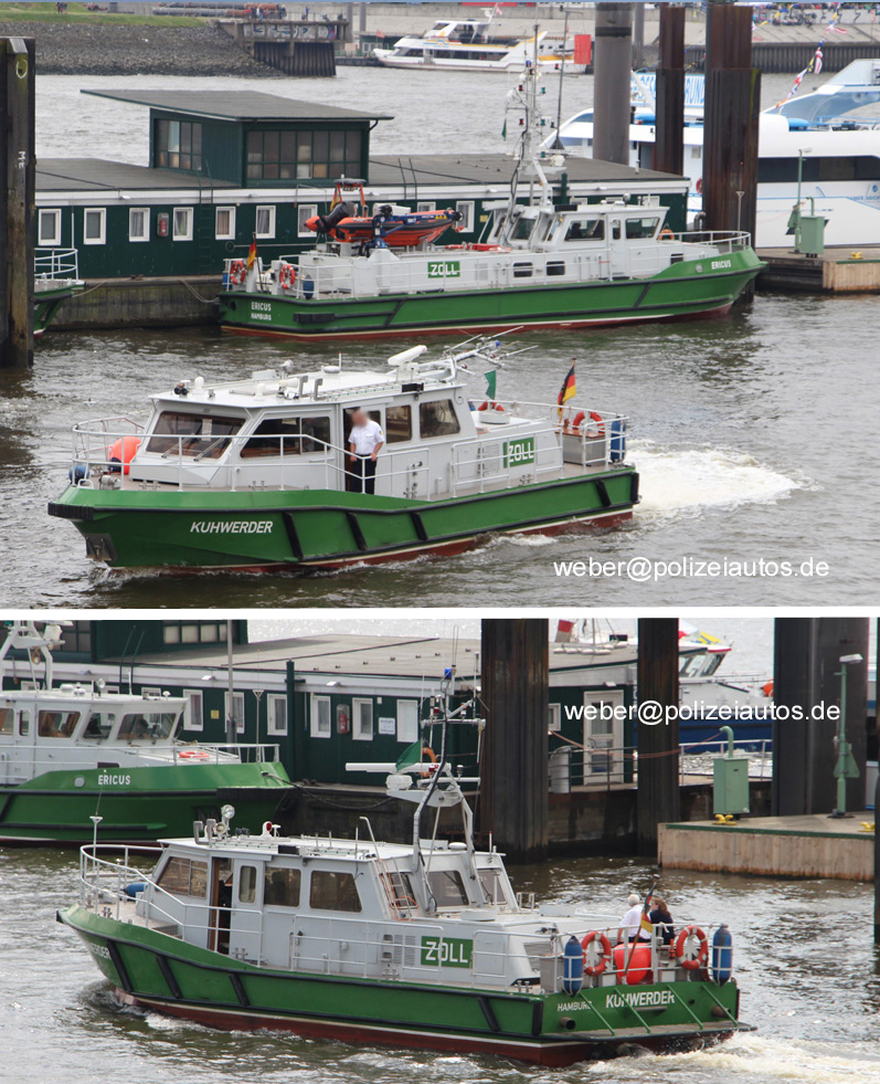 | Beschreibung: | Zollboot Kuhwerder im Hamburger Hafen. Technische Daten Baujahr: 1997 Bauwerft: Ernst Menzer Länge: 15,60 m Breite: 4,67 m Tiefgang: 0,70 m Verdrängung: ca. 15 t Maschine: 2x Volvo Penta TAMD 71 B/BT Maschinenleistung: 699 PS Antrieb: 2x Hamilton Jetantrieb Geschwindigkeit: 22 kn In 2017 wurde das Boot modernisiert und an die neue Farbgebung angepaßt. Desweiteren wurde das Boot in Hochwart umbenannt und an den Bodensee umstationiert. |