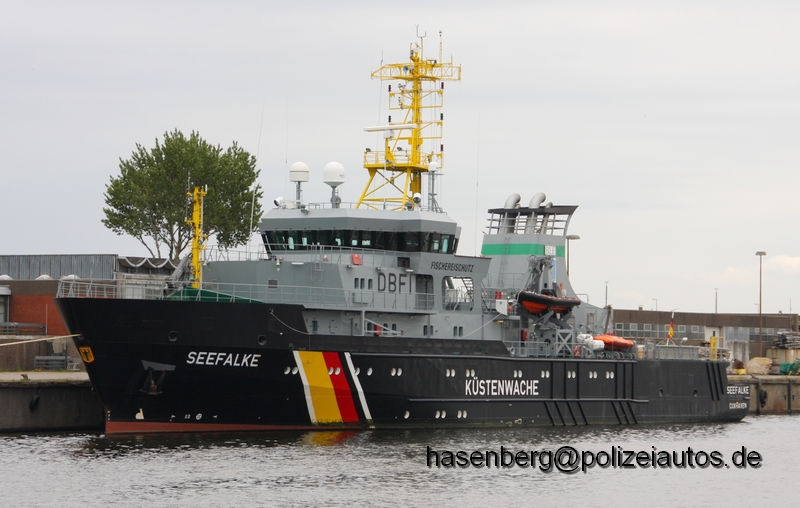 | Beschreibung: | Fischereischutzschiff Seefalke im Hamburger Hafen. Technische Daten Werft: Peene-Werft GmbH in Wolgast Baujahr: 2008 Eigner: Bundesministerium für Landwirtschaft und Ernährung (BLE) Baunummer: 559 Länge: 72,80 m Breite: 12,50 m Seitenhöhe: 6,80 m Konstruktionstiefgang: 5,00 m Antrieb: Semi-dieselelektrisch. Beide Verstellpropeller werden angetrieben über zwei Hauptmotoren des Typs MTU 20V4000 M73L und Getriebe. Die Antriebsleistung kann durch die beiden E-Fahrmotoren (twin booster operation) erhöht werden. Bei Betrieb beider Antriebssysteme wird eine Geschwindigkeit von ca. 19,7 kn erreicht. Möglich ist ein Antrieb auch nur über die E-Fahrmotoren. |