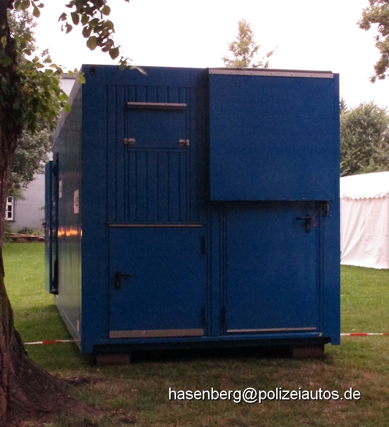 | Beschreibung: | Abrollbehälter Mobile Wache der Polizei Niedersachsen. Dieser Container wird z.B. bei Kontrollen oder Stadtfesten als Mobile Wache genutzt. Transportiert wird er dann z.B. von einem Wechselladerfahrzeug. Hersteller: Fa.Hachmeister |