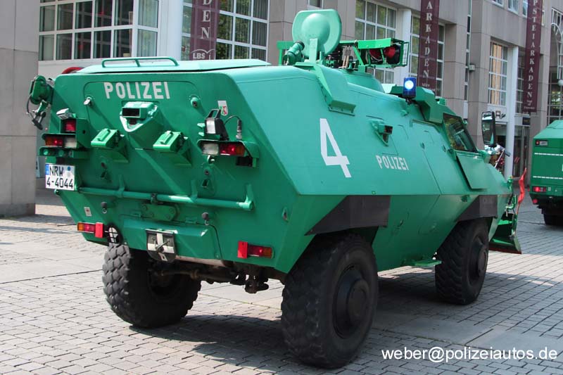 Sonderwagen 4 der Bereitschaftspolizei mit Lichtaufsatz, LED-Frontblitzern und auffällig lackiertem Räumschild.