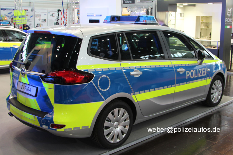 Opel Zafira Tourer mit silberner Grundfarbe, in der Version als Funkstreifenwagen, ausgestellt auf der GPEC 2014.