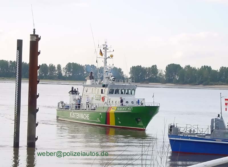 | Beschreibung: | Zollkreuzer Glückstadt mit Tochterboot Fortuna auf der Elbe im Bereich der Anlegestelle in Wedel (Willkomm-Höft -Schulauer Fährhaus-) Das Boot ist bereits das zweite Boot der Zollverwaltung mit diesem Namen (siehe auch HIER). Technische Daten Baujahr: 1991 Bauwerft: Fr. Fassmer GmbH & Co. KG, Berne/Motzen, Deutschland Länge: 28,62 m Breite: 6,20 m Tiefgang: 1,65 m Maschine/Leistung: 3 x MWM TBD 604 BV 8 mit 825 KW bei 1.745 U/min Geschwindigkeit: 26 kn Besatzung: 6 Personen. "Diese" Glückstadt wurde 2011 ausgemustert und verkauft. Am Rand ist noch das schlesw. holsteinische Polizeiboot Helgoland zu erahnen. |