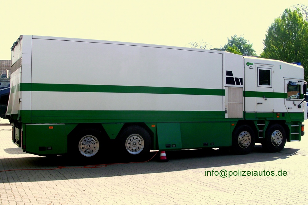 4-achsiges Sonderfahrzeug für Geld- und Werttransporte mit zwei Blau/Klar-farbenen Sondersignalanlagen.