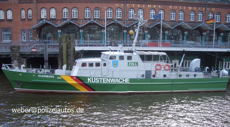 | Beschreibung: | Seit dem 08.09.2005 hat das Zollboot Oldenburg seinen (vermutlich) letzten Ankerplatz erreicht: In der Hamburger Speicherstadt ist es im Zollkanal als Teil des Deutschen Zollmuseums als Museumsschiff ausgestellt. Technische Daten: Bauwerft: Yacht- und Bootswerft Burmester; Bremen-Burg Baustoff: Aluminium Länge ü.a.: 28,07 m Länge i.d. CWL: 26,74 m Breite: 4,83 m Tiefgang: 1,44 m Bruttoraumgehalt: 78,14 BRT Antrieb: 2 x Diesel MTU - Typ: 8 V 331 TC 81 Dauerleistung: 2 x 815 PS bei 2260 U/m Überleistung: 2 x 900 PS bei 2340 U/m Höchstfahrt: 23,25 kn (43 km/Std.) Unterscheidungssignal: DLVG Indienststellung: Februar 1977 Nautische Ausrüstung: Radar, Kreiselkompass, Echolot, GPS-Navigator, GMDSS-Funkanlage, Funkfernschreiber, Navtex UKW-Seefunk, BOS-Behördenfunk Besatzung: 8 Beamte. |