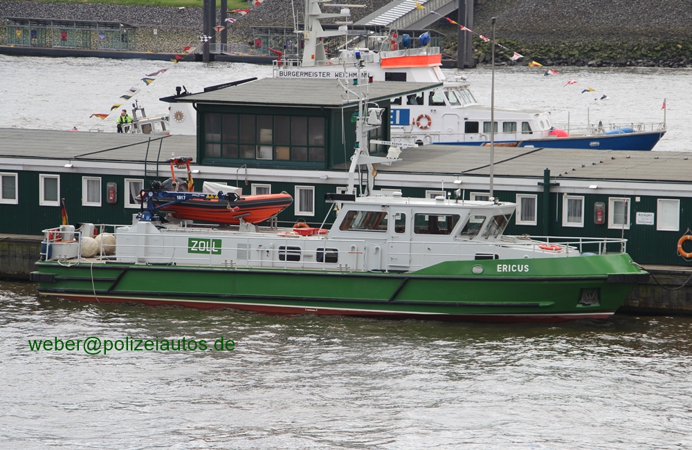 | Beschreibung: | Zollboot Ericus im Hamburger Hafen, nahe den Landungsbrücken. Zwischenzeitlich wurde es mit einem Tochterboot (einschl. Bootsdavid -Kran-, Hersteller: Amco Veba) nachgerüstet. In 2019 erhielt der Rumpf einen kobaltblauen Anstrich. |