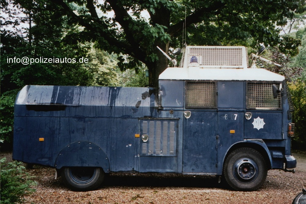 | Beschreibung: | Wasserwerfer 4500 der niederl. Politie. Aufbau: Saval-Kronenburg BV in NL-Hedel 6 Zylinder, 130 PS Pumpenmotor von VW mit 41 PS Baujahr: 1976, wurde von 1976 bis 1992 in den NL eingesetzt Länge : 6,25 m, Breite: 2,40 m, Höhe: 3,28 m Gewicht: 14 t Wassertankinhalt: 4500 l 3 Wasserkanonen auf der Kabine. Das Fahrzeug befindet sich im Polizeimuseum der NL in Apeldoorn. |