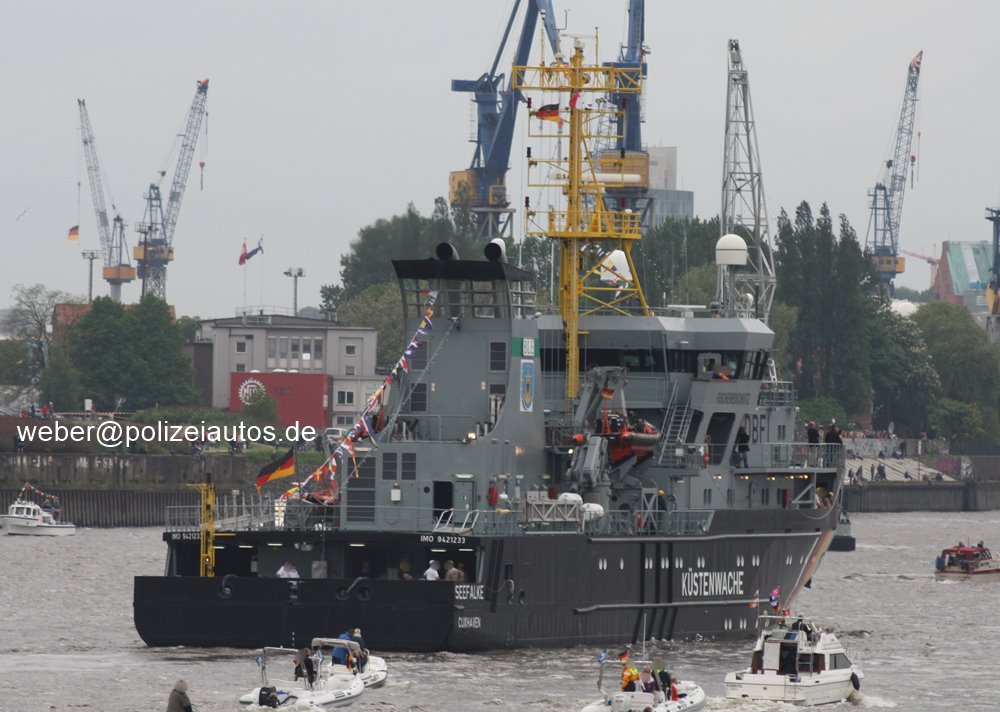 | Beschreibung: | Fischereischutzschiff Seefalke im Hamburger Hafen. Technische Daten Werft: Peene-Werft GmbH in Wolgast Baujahr: 2008 Eigner: Bundesministerium für Landwirtschaft und Ernährung (BLE) Baunummer: 559 Länge: 72,80 m Breite: 12,50 m Seitenhöhe: 6,80 m Konstruktionstiefgang: 5,00 m Antrieb: Semi-dieselelektrisch. Beide Verstellpropeller werden angetrieben über zwei Hauptmotoren des Typs MTU 20V4000 M73L und Getriebe. Die Antriebsleistung kann durch die beiden E-Fahrmotoren (twin booster operation) erhöht werden. Bei Betrieb beider Antriebssysteme wird eine Geschwindigkeit von ca. 19,7 kn erreicht. Möglich ist ein Antrieb auch nur über die E-Fahrmotoren. |