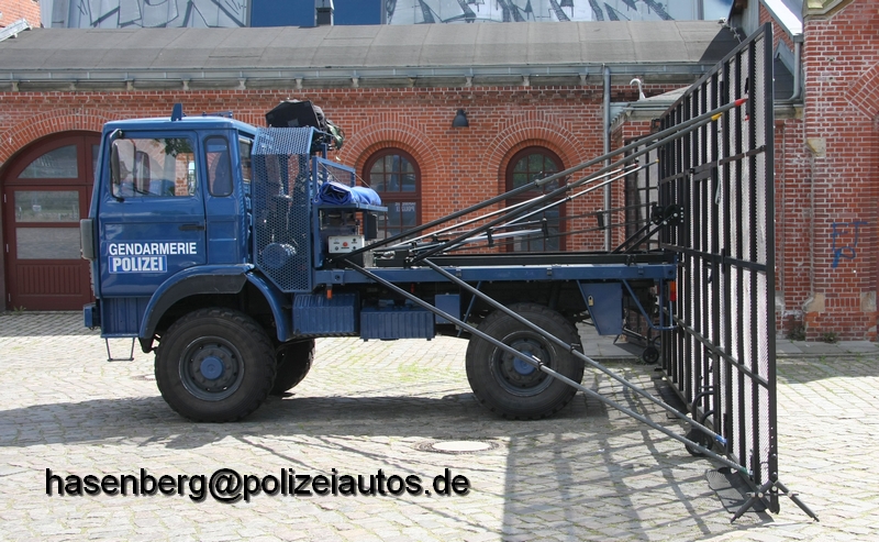Im Rahmen des G20 Gipfel kamen solche Fahrzeuge zum Einsatz. Den Einsatz macht ein Internationales Abkommen möglich. Das Absperrgitter wird mittels einer Hydraulik abgesenkt. Es kann eine max Breite von 9,70m abgesperrt werden. Das Fahrzeug wurde für dieses Einsatz mittels Magnettafeln als Polizeifahrzeug kenntlich gemacht. Auf dem Bild 4 sieht man das Fahrzeug in der Fahrstellung, mit eingeklapptem Gitter. |
