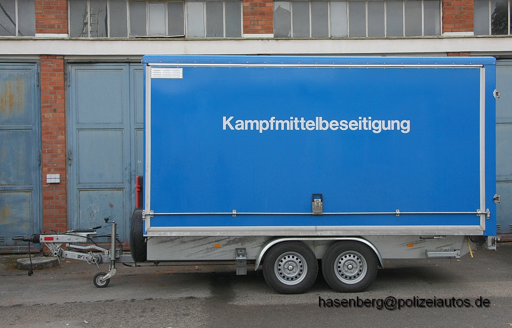 | Beschreibung: | Anhänger des Kampfmittelbeseitigungsdienst Niedersachsen. In diesem Anhänger wird eine Wasserstrahlschneidanlage zum heraustrennen von Zündmechanismen aus Kampfmittelblindgängern transportiert. Das heraustrennen erfolgt mit einem Wasserstrahl der mit 700bar auf den Stahlkörper auftrifft. Datenblatt Auf Bild 4 sieht man einen Teil der verlasteten Anlage. |