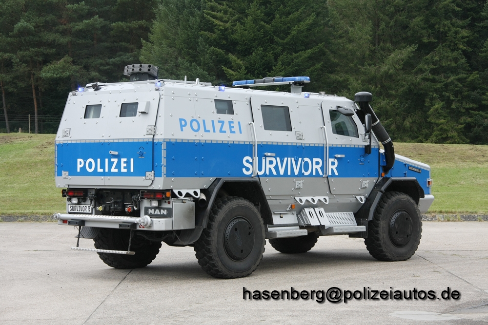 Dieses Fahrzeug wurde gemeinsam von den Firmen Rheinmetall und Achleitner für den polizeilichen Einsatz entwickelt. Es basiert auf einem serienmäßigen MAN TGM Fahrgestell mit einer Leistung von 330 PS bei einem maximalen Gewicht von 15 Tonnen. Anders als dieses Fahrzeug verfügt es über einen Blaulichtbalken als Warneinrichtung und eine andere Beschriftung. |