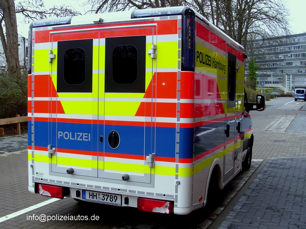 | Beschreibung: | Der bundeseinheitliche Rettungskraftwagen der Polizei Hamburg wurde inzwischen zusätzlich foliert: Polizei-Schriftzug auf der Motorhaube und am Heck, Polizei Hamburg auf den Seitenwänden, Polizeiwappen auf den Türen und großflächig gelbe Folien. Fotos: I. Kröning |