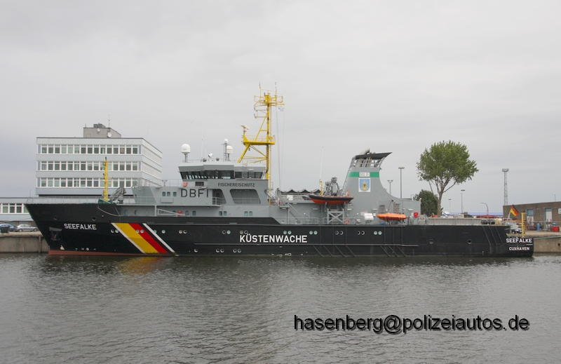 | Beschreibung: | Fischereischutzschiff Seefalke im Hamburger Hafen. Technische Daten Werft: Peene-Werft GmbH in Wolgast Baujahr: 2008 Eigner: Bundesministerium für Landwirtschaft und Ernährung (BLE) Baunummer: 559 Länge: 72,80 m Breite: 12,50 m Seitenhöhe: 6,80 m Konstruktionstiefgang: 5,00 m Antrieb: Semi-dieselelektrisch. Beide Verstellpropeller werden angetrieben über zwei Hauptmotoren des Typs MTU 20V4000 M73L und Getriebe. Die Antriebsleistung kann durch die beiden E-Fahrmotoren (twin booster operation) erhöht werden. Bei Betrieb beider Antriebssysteme wird eine Geschwindigkeit von ca. 19,7 kn erreicht. Möglich ist ein Antrieb auch nur über die E-Fahrmotoren. |