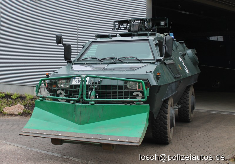 | Beschreibung: | Sonderwagen SW 4 mit Räumschild an der Fahrzeugfront. Bei diesem aus dem Bestand der Bundespolizei stammenden Fahrzeug wurden Ende 2014 die bisherigen Blaulichter durch LED-Kennleuchten ersetzt. Ebenso wurde die Lichtleiste mit LED-Leuchten ausgestattet sowie am Heck eine Rückfahrkamera montiert. |