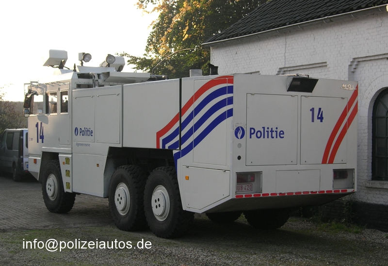 Beschreibung: | Wasserwerfer der Polizei Belgien. Die Indienststellung erfolgte im Jahr 1989. Technische Daten Motor: Caterpillar, 6 Zylinder, Hubraum 10,45 l Leistung: 210 kW Höchstgeschwindigkeit: 80 km/h Länge: 8,95m Breite: 2,5 m Höhe: 3,68 m zul. Gesamtgewicht: 28552 kg Leergewicht: 19172 kg Tankinhalt, Tank 1: 4200 l, Tank 2: 4800 l. |