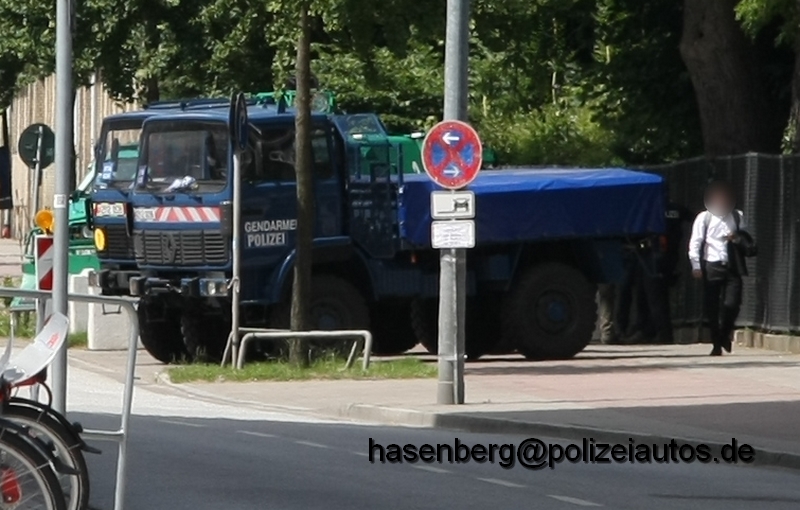 Im Rahmen des G20 Gipfel kamen solche Fahrzeuge zum Einsatz. Den Einsatz macht ein Internationales Abkommen möglich. Das Absperrgitter wird mittels einer Hydraulik abgesenkt. Es kann eine max Breite von 9,70m abgesperrt werden. Das Fahrzeug wurde für dieses Einsatz mittels Magnettafeln als Polizeifahrzeug kenntlich gemacht. Auf dem Bild 4 sieht man das Fahrzeug in der Fahrstellung, mit eingeklapptem Gitter. |
