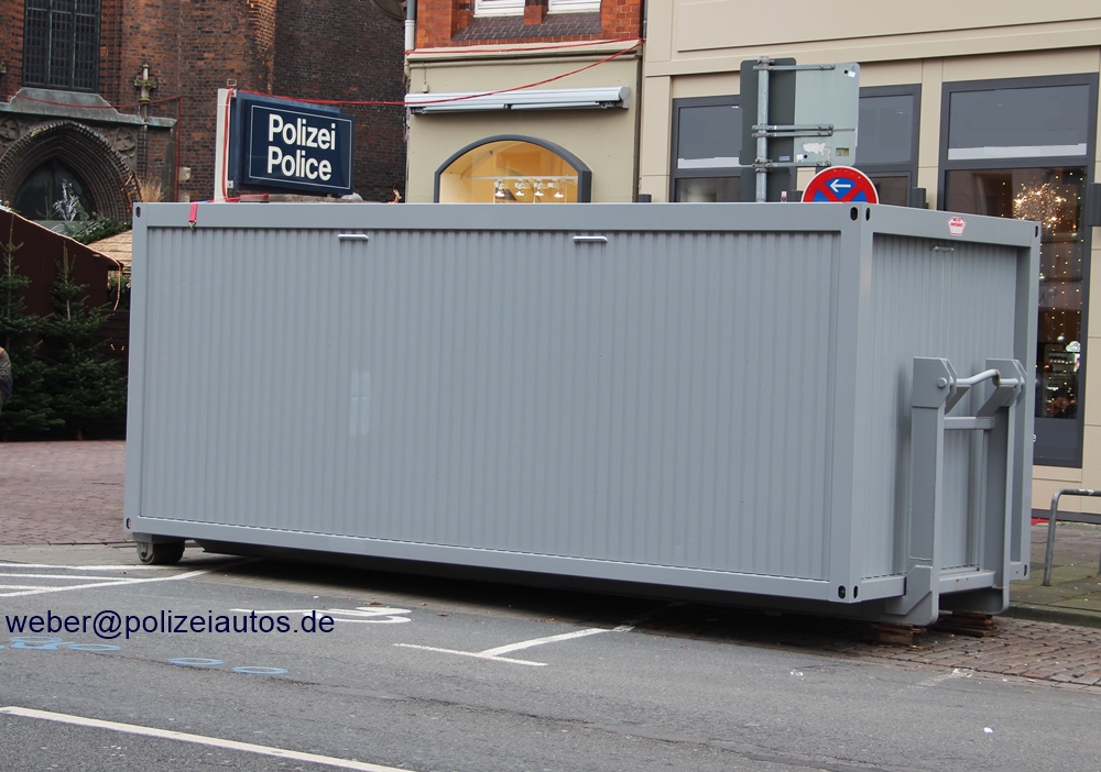 | Beschreibung: | Dieser Abrollbehälter der Polizei Niedersachsen wurde hier, auf dem Weihnachtsmarkt 2017 in der Landeshauptstadt Hannover, als Mobile Wache eingesetzt. Auf dem Containerdach war ein beleuchtbares Transparent mit Aufschrift Polizei / Police befestigt. Sie wurde im August 2017 erstmals auf dem Maschseefest Hannover eingesetzt. Zwischenzeitlich haben ein paar Umbaumaßnahmen stattgefunden, die sich insbesondere auf die Kennzeichnung beziehen. Diese Mobile Wache ist ein reiner Anzeigenaufnahme- und Vernehmungscontainer. Die Einsatzgebiete sind anlog zu dieser Variante zu sehen. |