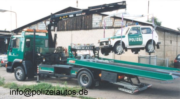 | Beschreibung: | Abschlepp- und Bergewagen, Aufbau Hartmann Bergemeister, 1997. Luftfederung Hinterachse, Bergeplateau mit Kipp-/Verschiebemechanik und hydr. Zusatzschienen, hydr. Hubbrille, Ladekran mit hydr. Abstützung, hydr. verschiebbare Seilwinde mit Funkfernbedienung, Jochträger mit hydr. Schwerpunktverstellung, 4 Rangierroller, Beleuchtungssatz Fotos und Infos: Michael Schüler, Polizei Brandenburg (www.polizei.brandenburg.de) |