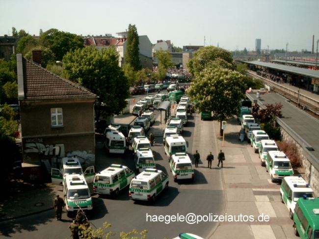 | Beschreibung: | Rund 8000 Polizeibeamte aus 11 Bundesländern sicherten am 01. Mai 2004 zahlreiche Veranstaltungen und Aufzüge in der Bundeshauptstadt. Das Bild zeigt den Beginn des NPD-Aufmarsches am Bahnhof Berlin-Lichtenberg. |