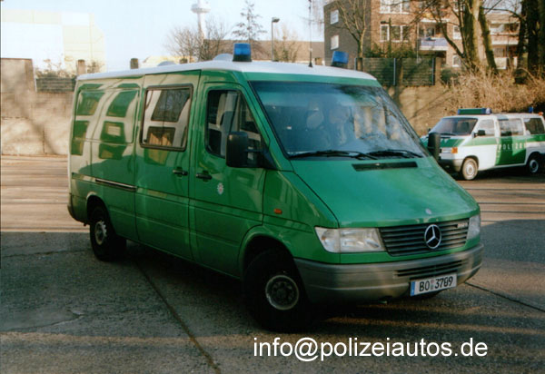 Gefangenentransportkraftwagen der Polizei in Bochum mit zwei Einzelblaulichtern vorne und Polizeistern auf den Türen.