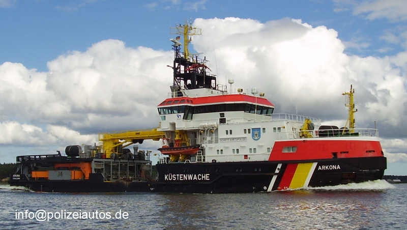 Schadstoffunfallbekämpfungsschiff (SUBS). Im Regelbetrieb wird das Schiff in der östlichen Ostsee für Aufgaben des Seezeichenbetriebes und der Schifffahrtspolizei eingesetzt. Im Bedarfsfall kann es darüber hinaus auch für Eisbrechaufgaben und zur Brandbekämpfung herangezogen werden. Mit einem Pfahlzug von über 40 t wird die Arkona im Rahmen der maritimen Notfallvorsorge des Bundes auch als Notfallschlepper vorgehalten (1. Foto: Peter Scholz, 2. Foto: Michatec, Textauszug und weitere Infos zu diesem Schiff www.hansa-online.de). |