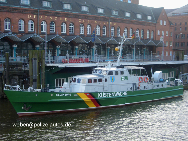 | Beschreibung: | Seit dem 08.09.2005 hat das Zollboot Oldenburg seinen (vermutlich) letzten Ankerplatz erreicht: In der Hamburger Speicherstadt ist es im Zollkanal als Teil des Deutschen Zollmuseums als Museumsschiff ausgestellt. Technische Daten: Bauwerft: Yacht- und Bootswerft Burmester; Bremen-Burg Baustoff: Aluminium Länge ü.a.: 28,07 m Länge i.d. CWL: 26,74 m Breite: 4,83 m Tiefgang: 1,44 m Bruttoraumgehalt: 78,14 BRT Antrieb: 2 x Diesel MTU - Typ: 8 V 331 TC 81 Dauerleistung: 2 x 815 PS bei 2260 U/m Überleistung: 2 x 900 PS bei 2340 U/m Höchstfahrt: 23,25 kn (43 km/Std.) Unterscheidungssignal: DLVG Indienststellung: Februar 1977 Nautische Ausrüstung: Radar, Kreiselkompass, Echolot, GPS-Navigator, GMDSS-Funkanlage, Funkfernschreiber, Navtex UKW-Seefunk, BOS-Behördenfunk Besatzung: 8 Beamte. |