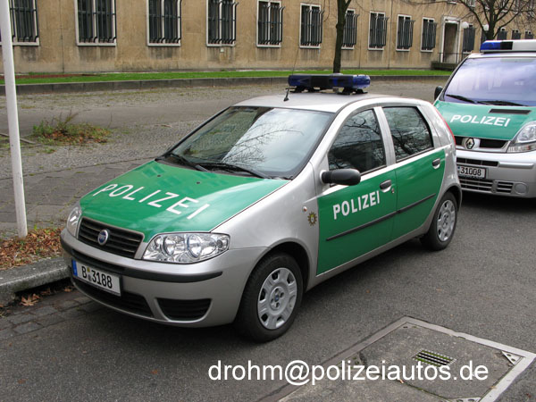 | Beschreibung: | Der Fiat Punto wurde in den Polizeidienst übernommen und mit einer Blaulichtanlage und Behördenkennzeichen ausgestattet. Das Fahrzeug wird vom Zentralen Objektschutz (Direktion Zentrale Aufgaben ZOS) genutzt. |