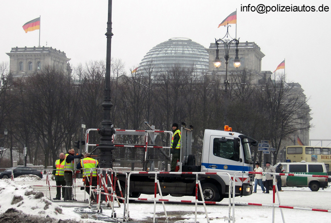 | Beschreibung: | Sicherheitslogistiker der Berliner Polizei im Einsatz mit dem Gittertransportfahrzeug vor dem Brandenburger Tor. Im Hintergrund ist das Reichstagsgebäude zu sehen. Foto: sj1 |
