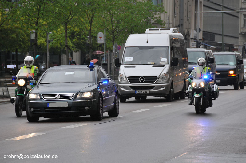 | Beschreibung: | Kolonne anläßlich der Tagung der Nato-Außenminister im April 2011 in Berlin. Im Einsatz: Sondergeschützter PKW VW Phaeton, eine BMW K75 und eine Moto Guzzi des ZVkD |