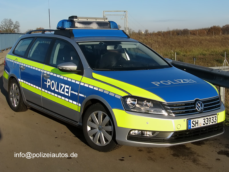 Funkstreifenwagen der Autobahnpolizei Schleswig-Holstein mit gelber Warnmarkierung seit Herbst 2012.