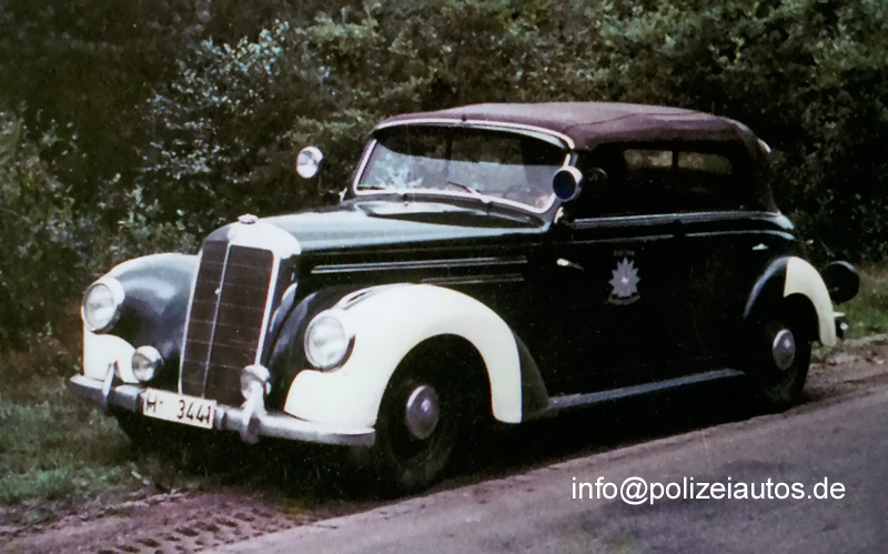 | Beschreibung: | 4-türiges Cabrio als Funkstreifenwagen der Polizei Niedersachsen. Baujahr: um 1952 Hubraum: 2195 ccm Leistung: 80 PS Höchstgeschwindigkeit: 145 km/h |