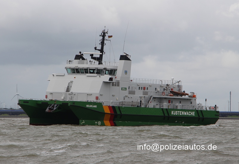 | Beschreibung: | Zollkreuzer Helgoland in SWATH-Bauweise. Technische Daten: Schiffstyp: Zollkreuzer, SWATH-Bauweise, Bauwerft: TKMS Blohm + Voss Nordseewerke, Stapellauf: 2009 Länge: 49,35m Breite: 19,00m Tiefgang max 4,55m Verdrängung: ca. 1000 Besatzung: 14 Mann Maschine: dieselelektrisch Dieselgeneratoren: 4 x MTU 16V 4000 M 40B à 2.200 kW (4 x 2.992 PS) Elektrische Antriebsmotoren: 2 x Siemens, Asynchronmotoren à 3.800 kw (2 x 5.168 PS) Elektrisches Fahrnetz: 690 V/60 Hz AC mit zwei Frequenzumrichtern Bugstrahlruder: 300 kW Maschinenleistung: 11.965 PS (8.800 kW) Geschwindigkeit: max. 20 kn (37 km/h). Tochterboot KEGELROBBE Fotos 1-3: sojus31 Das Schwesterschiff gibt es HIER zu sehen. |