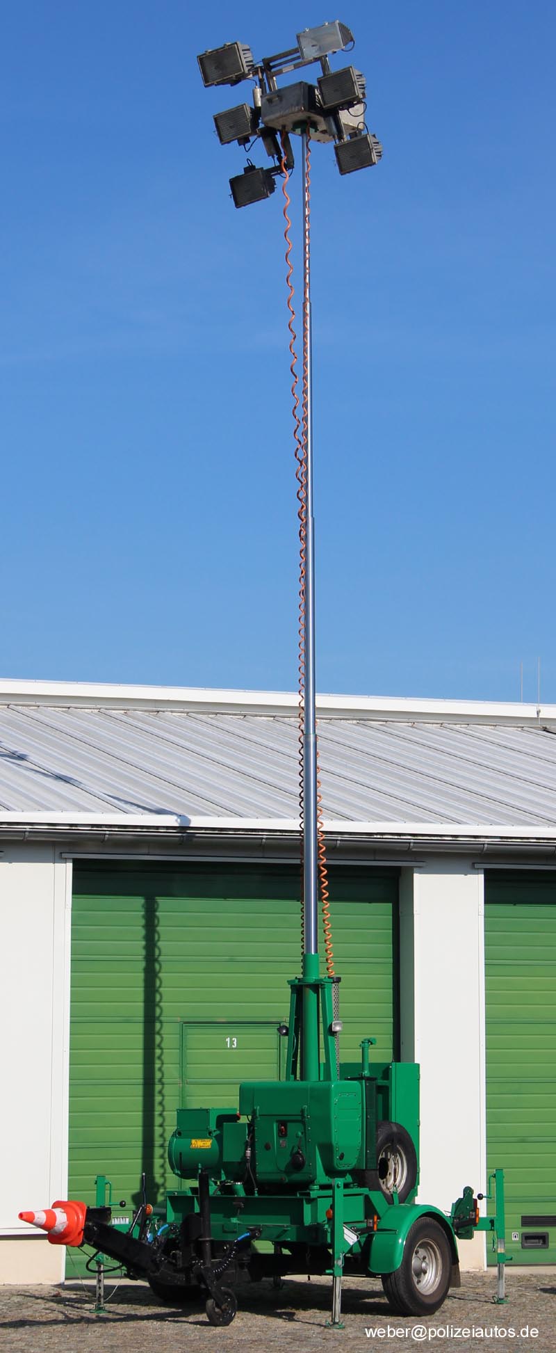 | Beschreibung: | Lichtmastanhänger der sächsischen Bereitschaftspolizei. Beschreibung: Leuchtenträger mit 6 Halogen-Flutlichtstrahlern auf Teleskopmast, hydraulisch ausfahrbar bis 9,5m ( wie auf dem Bild). Lichtleistung: 10000 Watt |