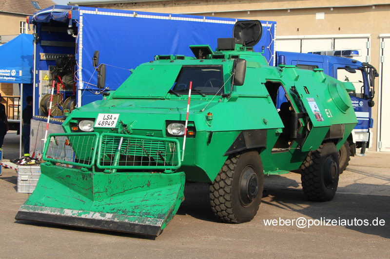 | Beschreibung: | Sonderwagen SW 4 der Bereitschaftspolizei Sachsen-Anhalt, mit Räumschild samt Peilstangen und einseitig hochgeklappter Scheibenpanzerung. |