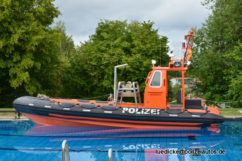 Beiboot des Einsatzbootes BP 65 Eschwege, auf den Fotos ausgestellt bei einem Tag der offenen Tür in einem Schwimmbecken bzw. aufgeständert
