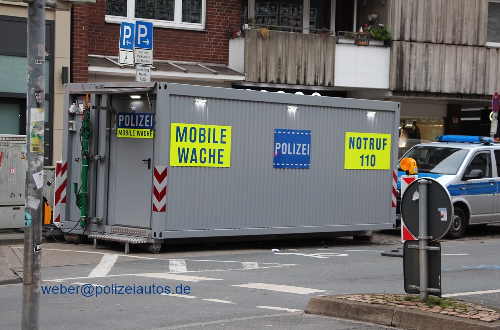 Dieser Abrollbehälter der Polizei Niedersachsen wird bei Kontrollen oder Veranstaltungen (hier auf dem Weihnachtsmarkt 2018 in der Landeshauptstadt Hannover) als Mobile Wache eingesetzt. Die Zentrale Polizeidirektion in Hannover stellt diesen Einsatzcontainer landesweit den Polizeidirektionen insbesondere für Einsätze auf Volksfesten, Konzerten und Großkontrollen auf Landes- und Bundesstraßen / Bundesautobahnen zur Verfügung, um den Einsatzkräften einen witterungsunabhängigen und effektiven Ersten Angriff zur gewährleisten. Der Container wurde auf allen Seitenwänden auffällig beschriftet. |