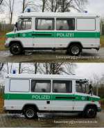 Halbgruppenkraftwagen (HGrukw), der Bereitschaftspolizei Bremen. Das ehemals grün/weiße Fahrzeug (Vergleichsfoto) erhielt später eine blaue Folierung. Es wurde auch als Instkw genutzt. Fotos und Infos: Jan Erik Karwacik |