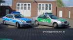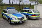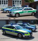 Funkstreifenwagen der Autobahnpolizei, hier des Herstellers Mercedes-Benz (E-Klasse Limousine und T-Modell), in der mittlerweile alten Fabgebung, nur silber/blau und in der neuen Zusammensetzung mit tagesleuchtgelb. Auf zwei Fotos steht noch ein aktueller Audi A6 Avant dabei. |
