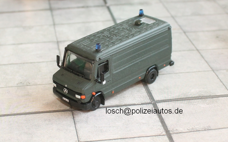 Als Basis für diesen Gefangenentransporter der Bundespolizei diente ein Busch-Modell des Mercedes T2 Kastenwagen mit dem mittleren Radstand. Bei diesem kleinen Umbau wurde zunächst eine Öffnung für das Dachfenster rausgesägt, die seitliche Schiebetür zu einer Drehtür umgearbeitet und die Doppelhecktüren verschlossen. Nach dem Lackieren wurde zwischen Fahrerkabine und Aufbau eine Trennwand eingebaut und Details wie Fenstergummis, Scheinwerfer und Blinker farblich hervorgehoben. Abschließend wurden noch Details wie die Dachfensterverglasung, Dachlüfter, Blaulichter, Spiegel und Starktonhörner auf der vorderen Stoßstange montiert. Umbau: Losch