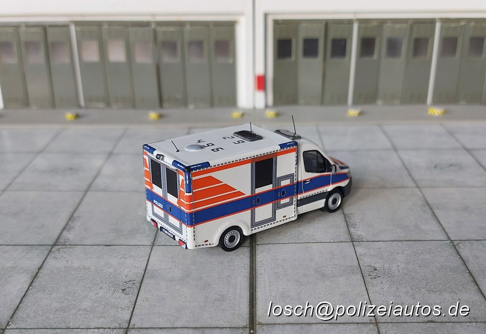 Als Basis dieses Modells diente eine Minikit von Herpa, von dem Kabine und Fahrgestell mit leichten Änderungen an der Hinterachse, Einzel- statt Doppelbereifung, übernommen wurden. Von B&K Modellbau stammt der Aufbau als 3D-Druck, an dem lediglich Schleifarbeiten durchgeführt sowie die angegossene Dachluke entfernt und die Lichtleiste an der Unterkante der Kofferrückseite angepasst wurden. Nach dem Lackieren wurden passende Decals von Markus Ortner, die Baulichtecken in Form von Decals und passende Dachluken von Flavio Müller aufgebracht. Ergänzt wurde das Modell noch durch vorbildgerechte Fliegersichtkennung, selbst erstellte Kennzeichen sowie angepasste Außenspiegel, Rückfahrkamera, Antennen und Schmutzlappen.