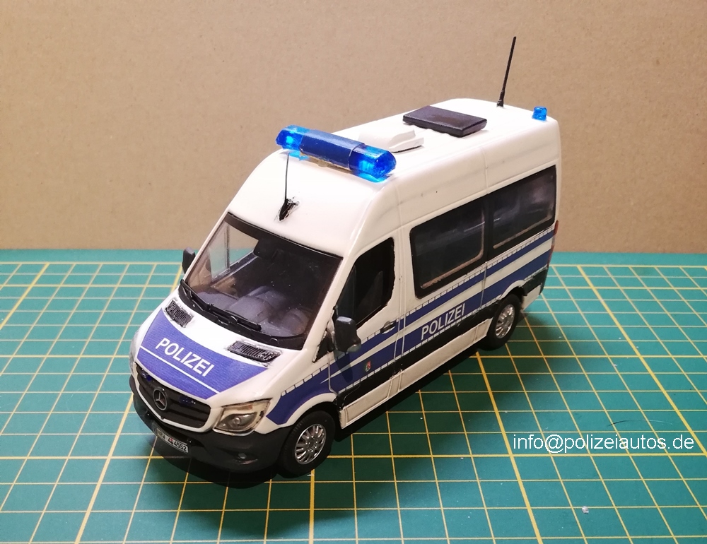 Es wurde demontiert und in weiß lackiert. Nach dem Trocknen und Zusammenbau wurden die Folierung und die NRW-Kennzeichen in 1:43, von der Fa. DS design, angebracht. Die Antennen, Blaulichter, die Klimaanlage und das Dachfenster wurden aus meinem Vorrat ergänzt. Leider gab es in Maßstab 1:43 kein Modell mit Flachdach.