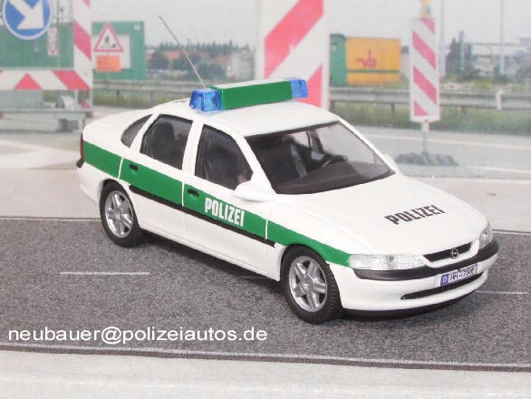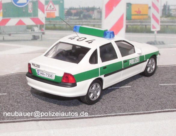 Modell wurde komplett umlackiert. Die Aufschrift "POLIZEI" und eine Funk-Dachnummer wurden angebracht. Außerdem wurde das Modell mit einer Hella RTK-Blaulichtanlage und einer Funkantenne ausgestattet. (Eigenbau: Neubauer)