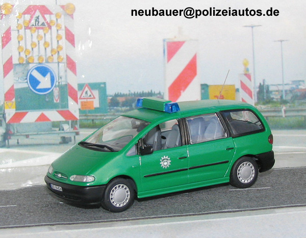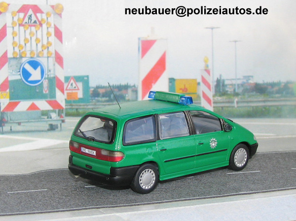 Beim Minichamps Grundmodell musste zuerst das vorhandene Glasdach geschlossen werden. Dann wurde das Modell komplett in Minzgrün umlackiert. Nach dem lackieren wurden kleinere Details, wie Türgriffe, Seiten- und Stoßfängerleisten farblich angepasst. Desweiteren wurde das Modell vorbildgerecht mit dem BGS-Wappen, einer Hella RTK-Blaulichtanlage, sowie einer Funkantenne ausgestattet. (Eigenbau: Neubauer)