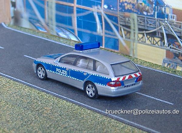 Ein Werbemodell von Mercedes-Benz wurde silber lackiert, mit blauer Farbe bemalt und mit Blaulichtbalken und Beschriftungen ausgestattet. Umbau: Brückner