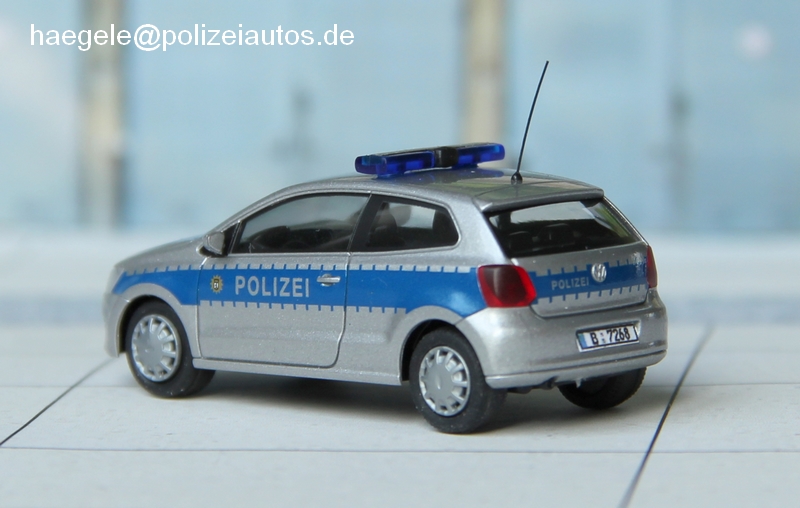 Das Grundmodell von Herpa wurde noch etwas verfeinert. Dazu wurde der Sockel unter dem Blaulichtbalken entfernt und der obere Teil des Balkens silber lackiert. Die Chromteile und Nebelscheinwerfer an der Front wurden mittels matt schwarzem Lack entfernt und Räder mit einfachen Radzierblenden montiert. Eine Antenne und Kennzeichen schließen die Ergänzungen ab (Haegele).