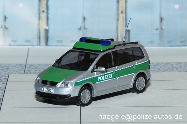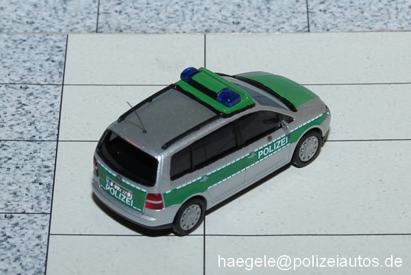 Beim Polizei-Modell von Wiking wurden grüne Flächen auf die Motorhaube lackiert. Am Heck wurden neben einer Antenne auch eine dritte Bremsleuchte und das VW-Logo dargestellt. Zudem erhielt die Miniatur vorbildgerechte Kennzeichen. Die Dachplatte entstand im Eigenbau, darauf montiert wurde ein angepasster Blaulichtbalken von Herpa (Haegele).