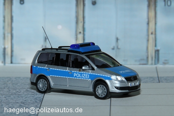 Beim Polizei-Modell von Wiking wurden am Heck eine Antenne und eine dritte Bremsleuchte angebracht. Zudem erhielt die Miniatur vorbildgerechte Kennzeichen. Die Dachplatte entstand im Eigenbau, darauf montiert wurde ein angepasster Blaulichtbalken von Herpa (Haegele).