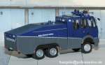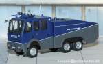 Bei dem Grundmodell von Rietze wurden Dachfenster eingearbeitet und die Stoßstange dem Original angepasst. Die grauen Flächen wurden neu lackiert, die seitlichen Reflektoren versetzt und die Beschriftung um die taktischen Kennzeichnungen sowie den POLIZEI-Schriftzug an der Front ergänzt. Abschließend wurden die Fenstergummis schwarz und die Blinker orange abgesetzt und noch eine Antenne montiert (Haegele).