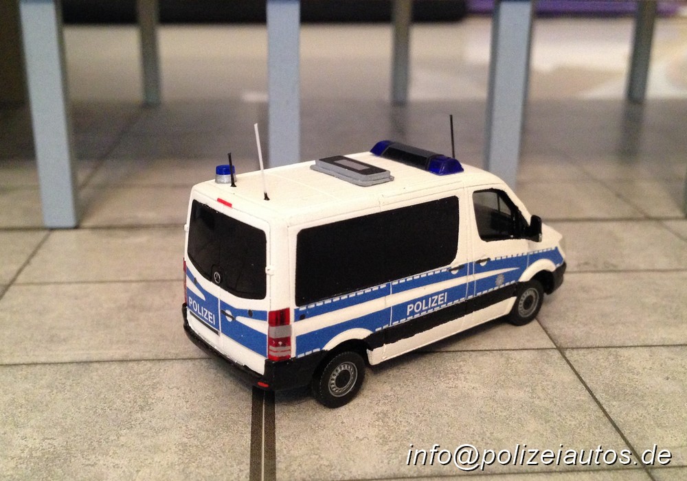 Bei dem Resinbausatz musste zunächst das Fahrgestell und die Inneneinrichtung an die Resinkarosse angepasst werden. Nun wurde die Karosse mit Airbrush lackiert. Nach dem Trocknen wurden Decals der Fa. Ds-Design angebracht und das Modell mit sämtliche Details wie Dachluke, Blaulichtbalken, Heckblaulicht, Antennen, Frontblitzer und Hoheitszeiche versehen.