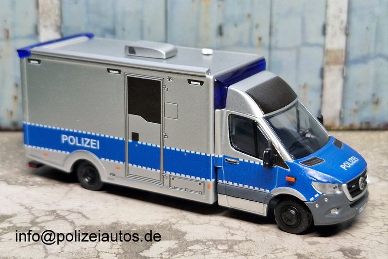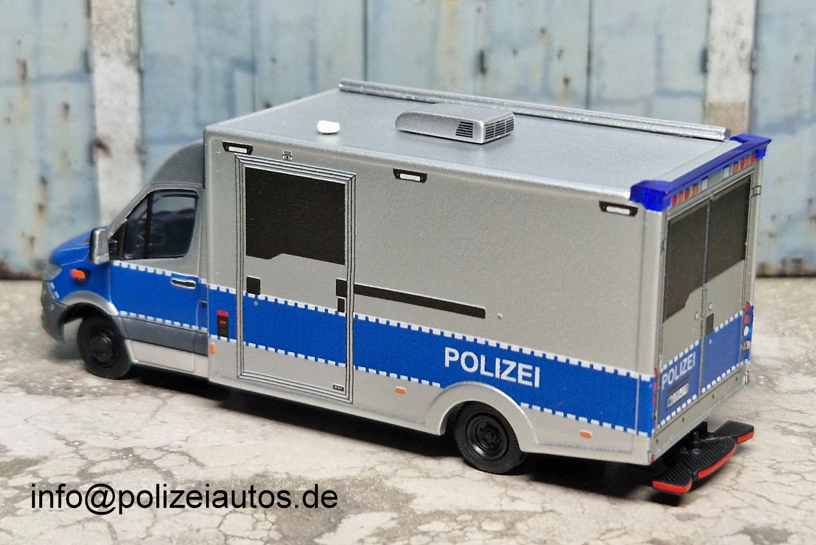 Das Grundmodell war ein Rettungswagen auf Sprinter-Basis der Firma WAS von Rietze. Der Aufbau wurde mit Hilfe von zwei Grundmodellen zu der langen Version umgebaut. Nach der silbernen Lackierung wurden Decals und weitere Kleinteile angebracht. Die Decals wurden für dieses Modell von MOrDec.de angefertigt.